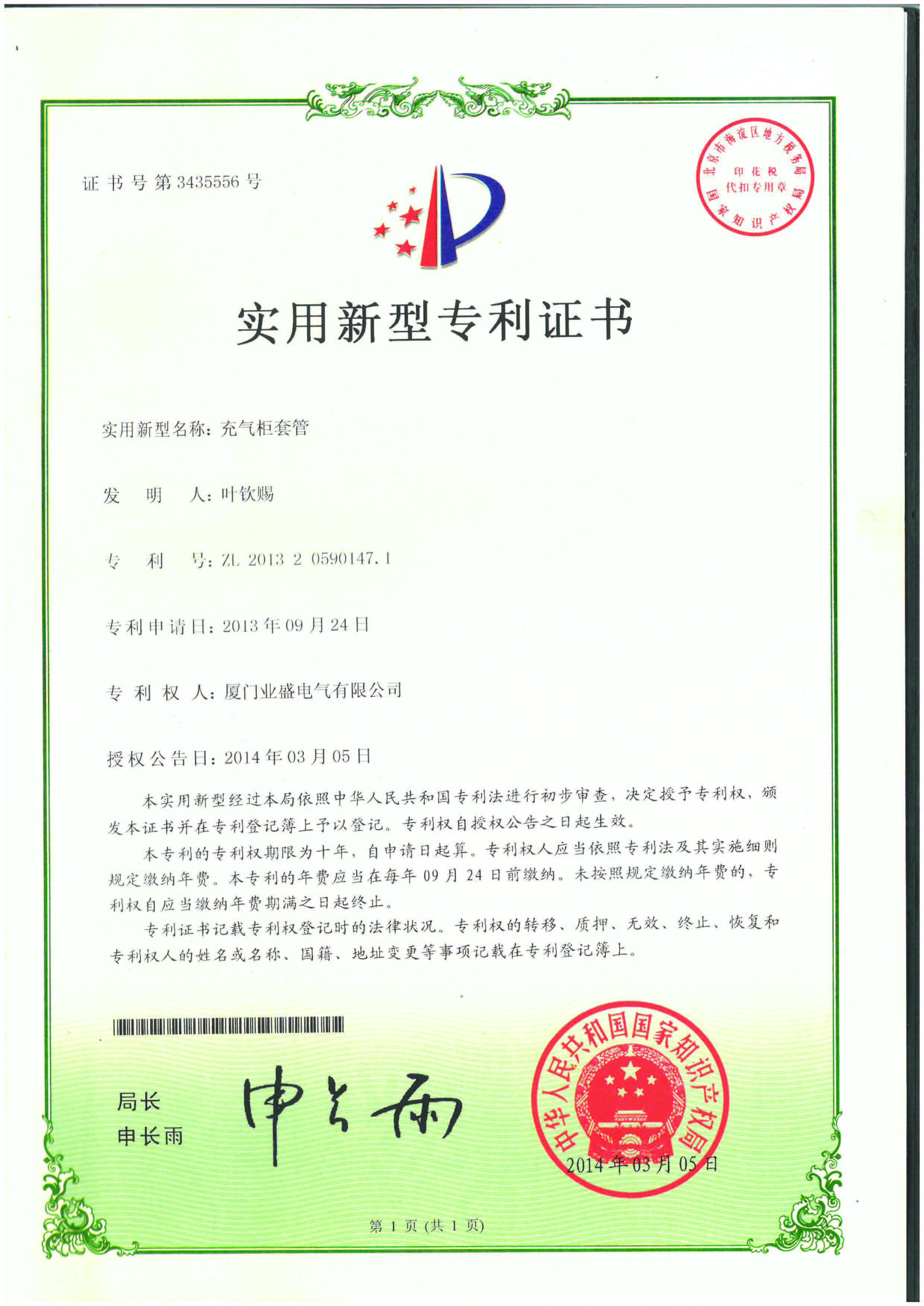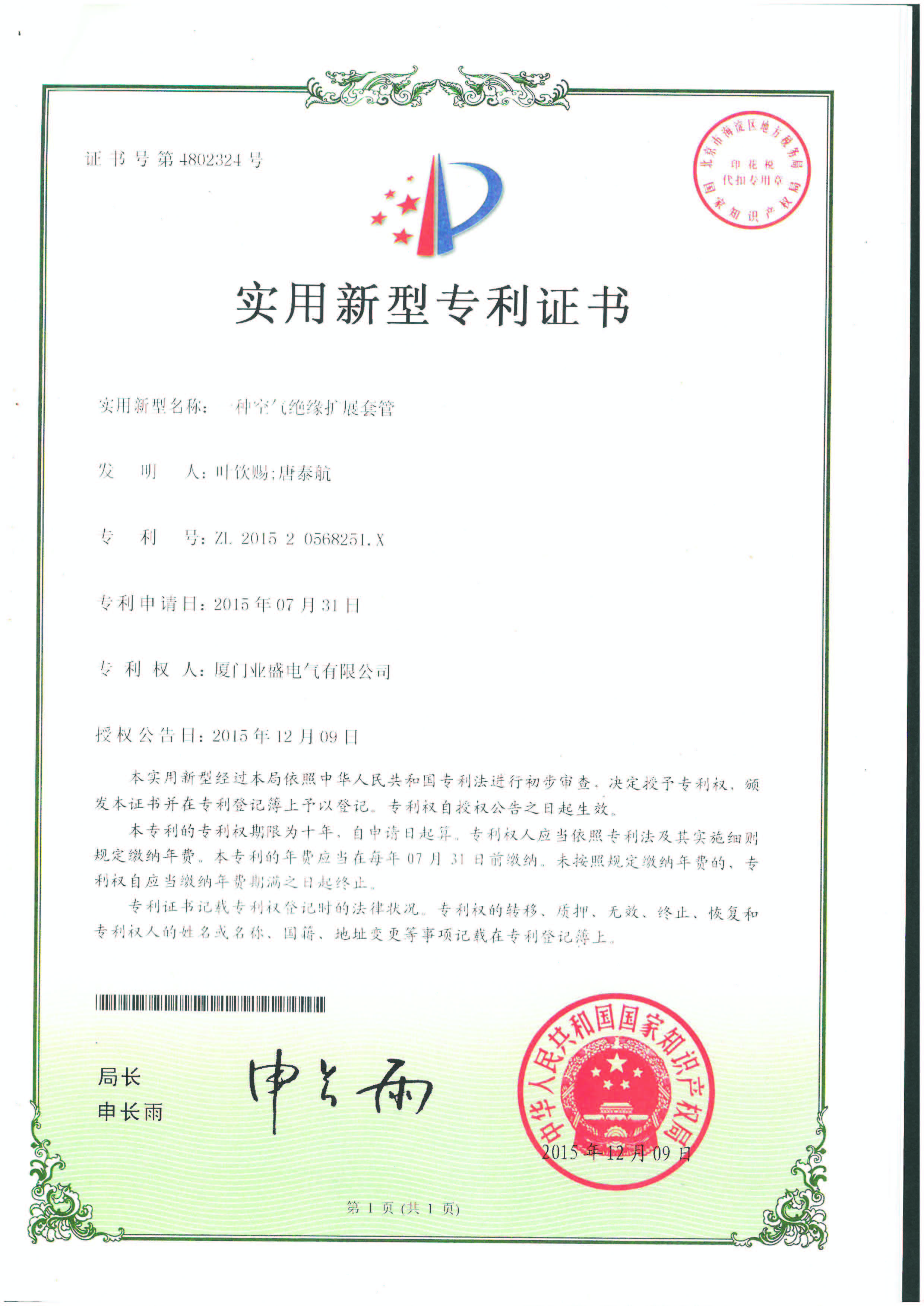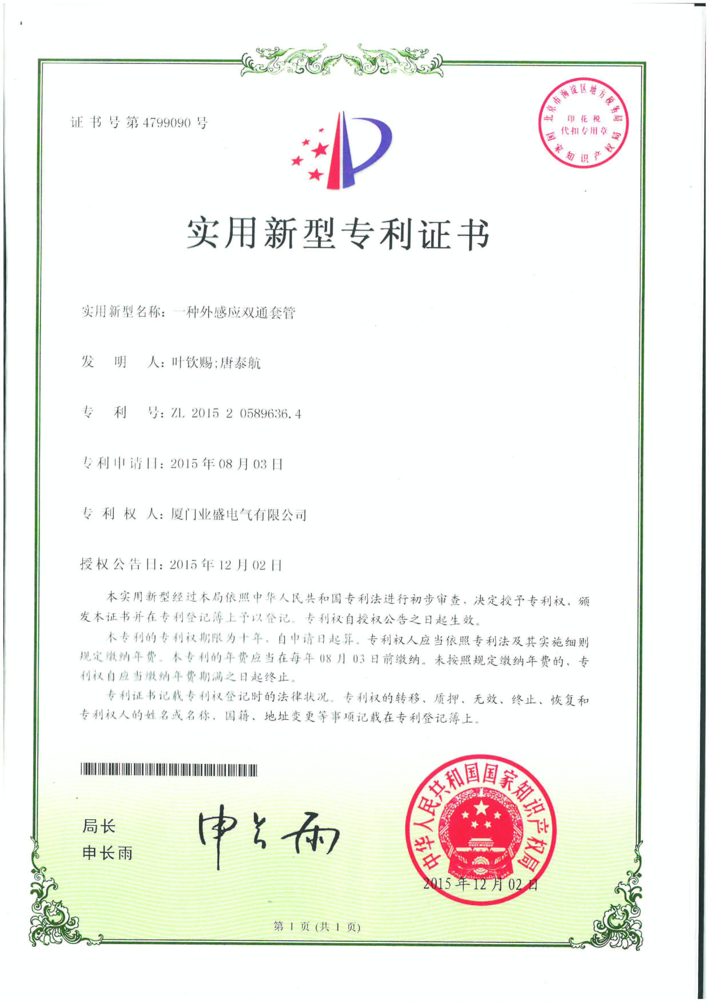 實(shí)用新型專利證書