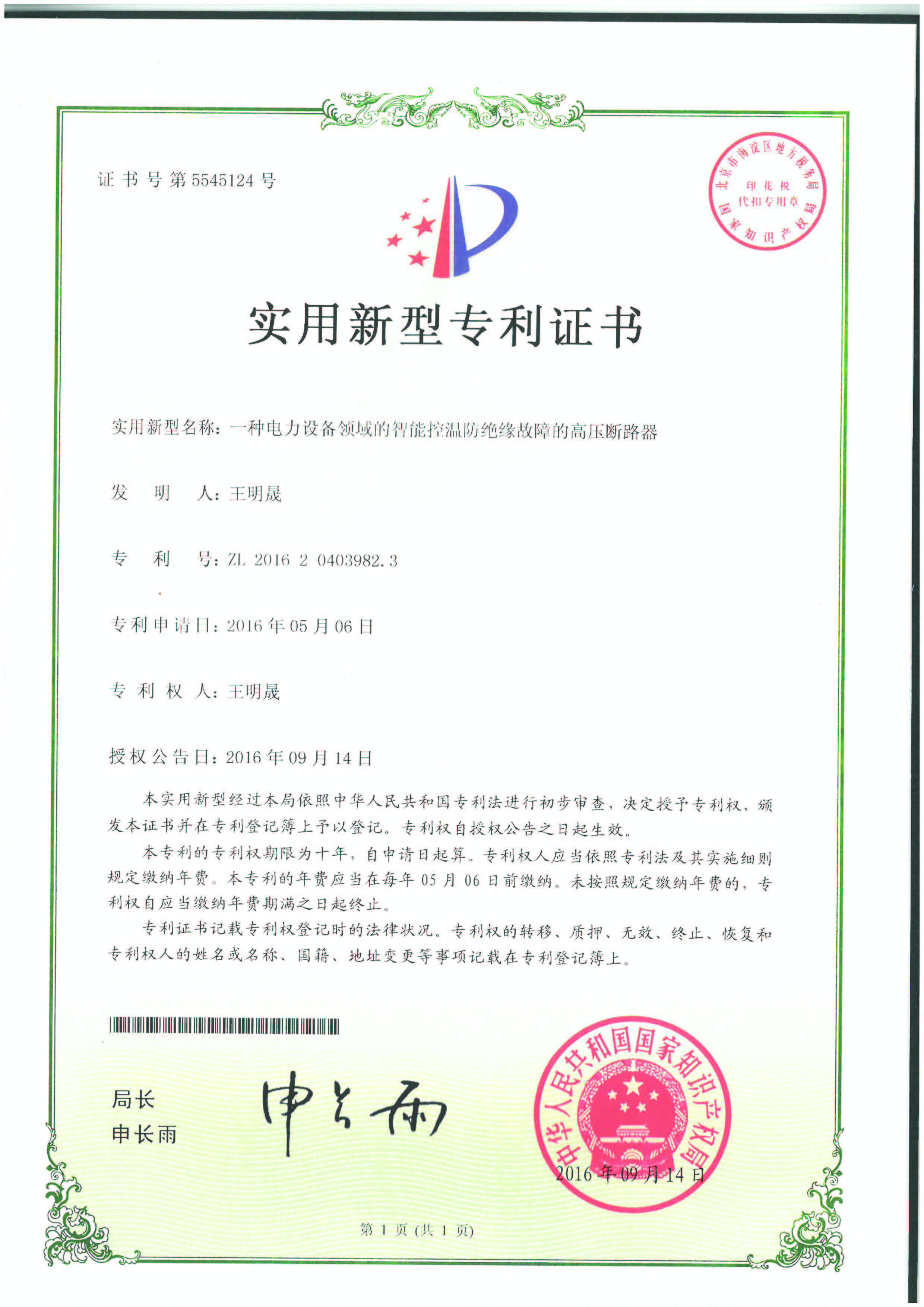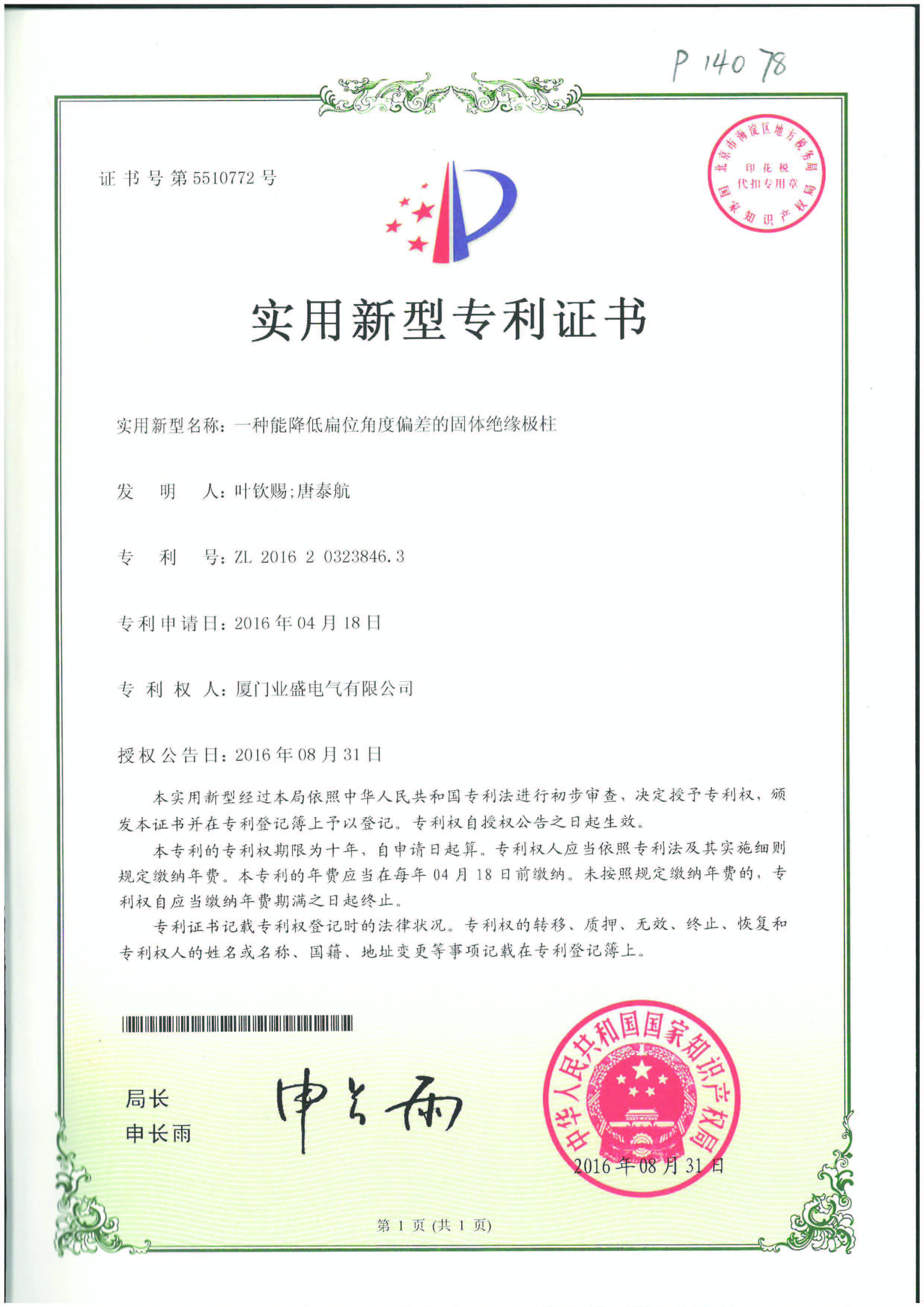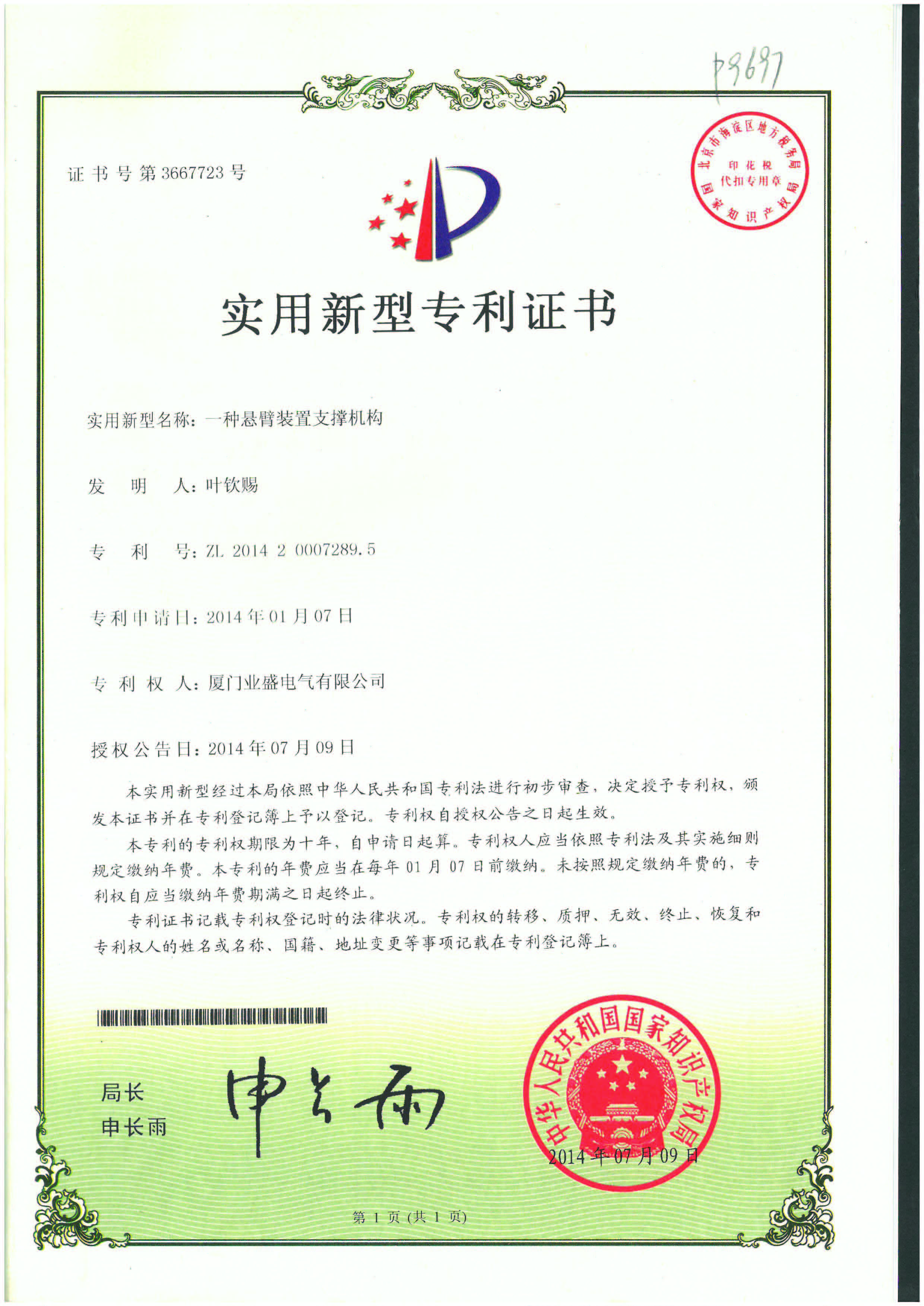 實(shí)用新型專利證書
